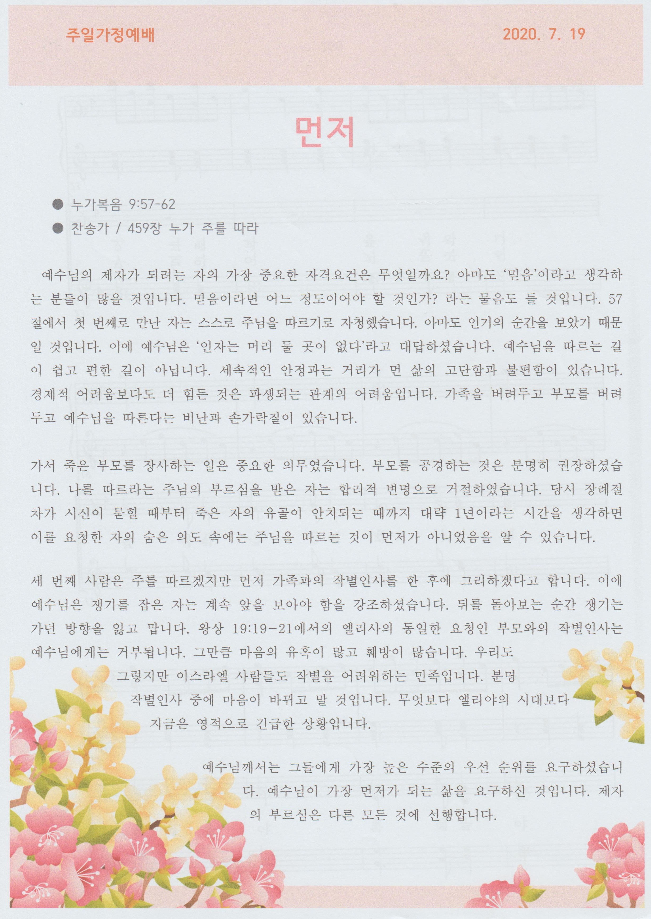 예수님의 제자가 되려는 자의 가장 중요한 자격요건은 무엇일까요? 아마도 ‘믿음’이라고 생각하는 분들이 많을 것입니다. 믿음이라면 어느 정도이어야 할 것인가? 라는 물음도 들 것입니다. 57절에서 첫 번째로 만난 자는 스스로 주님을 따르기로 자청했습니다. 아마도 인기의 순간을 보았기 때문일 것입니다. 이에 예수님은 ‘인자는 머리 둘 곳이 없다’라고 대답하셨습니다. 예수님을 따르는 길이 쉽고 편한 길이 아닙니다. 세속적인 안정과는 거리가 먼 삶의 고단함과 불편함이 있습니다. 경제적 어려움보다도 더 힘든 것은 파생되는 관계의 어려움입니다. 가족을 버려두고 부모를 버려두고 예수님을 따른다는 비난과 손가락질이 있습니다.