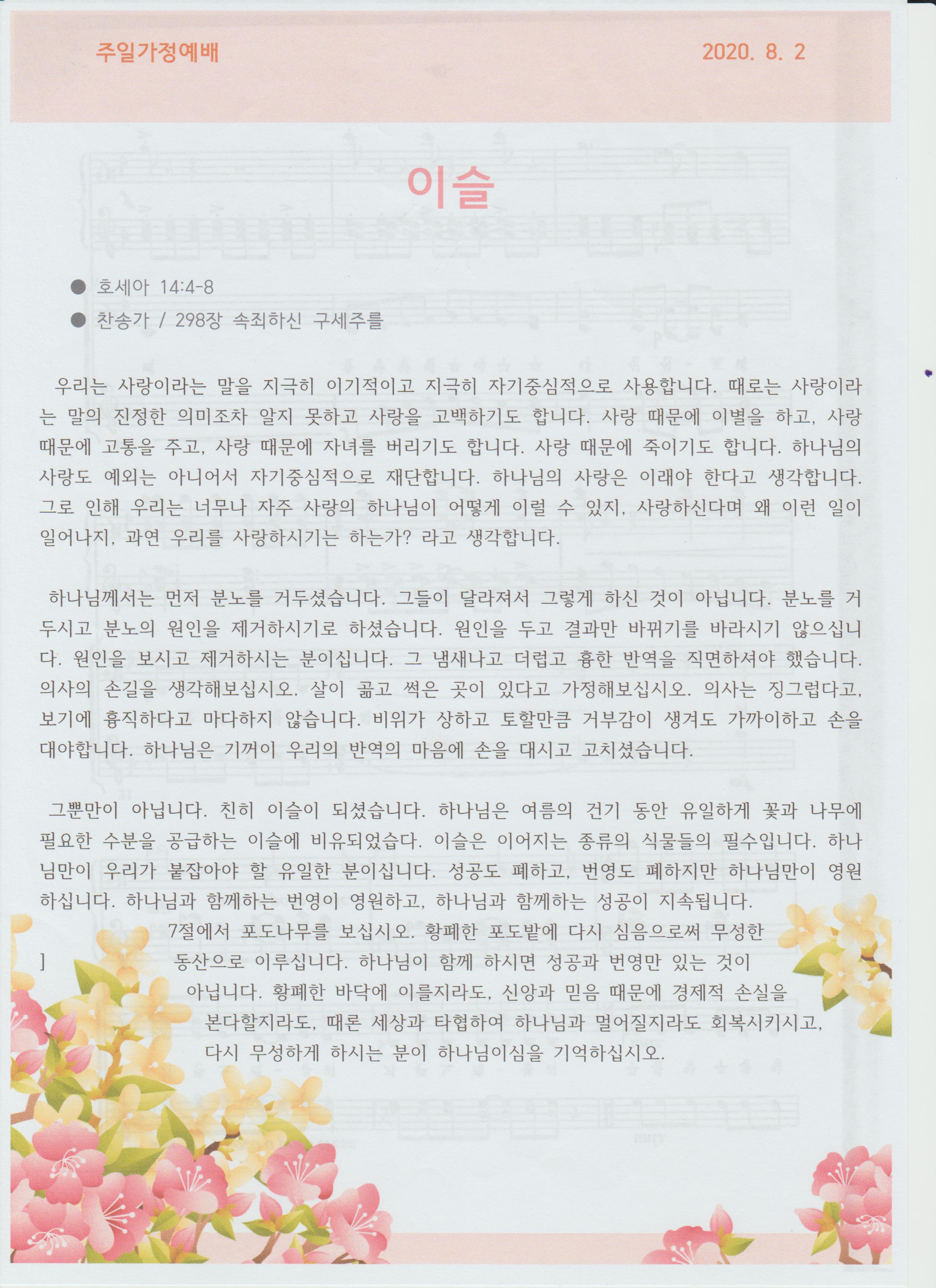 그뿐만이 아닙니다. 친히 이슬이 되셨습니다. 하나님은 여름의 건기 동안 유일하게 꽃과 나무에 필요한 수분을 공급하는 이슬에 비유되었습다. 이슬은 이어지는 종류의 식물들의 필수입니다. 하나님만이 우리가 붙잡아야 할 유일한 분이십니다. 성공도 폐하고, 번영도 폐하지만 하나님만이 영원하십니다. 하나님과 함께하는 번영이 영원하고, 하나님과 함께하는 성공이 지속됩니다.