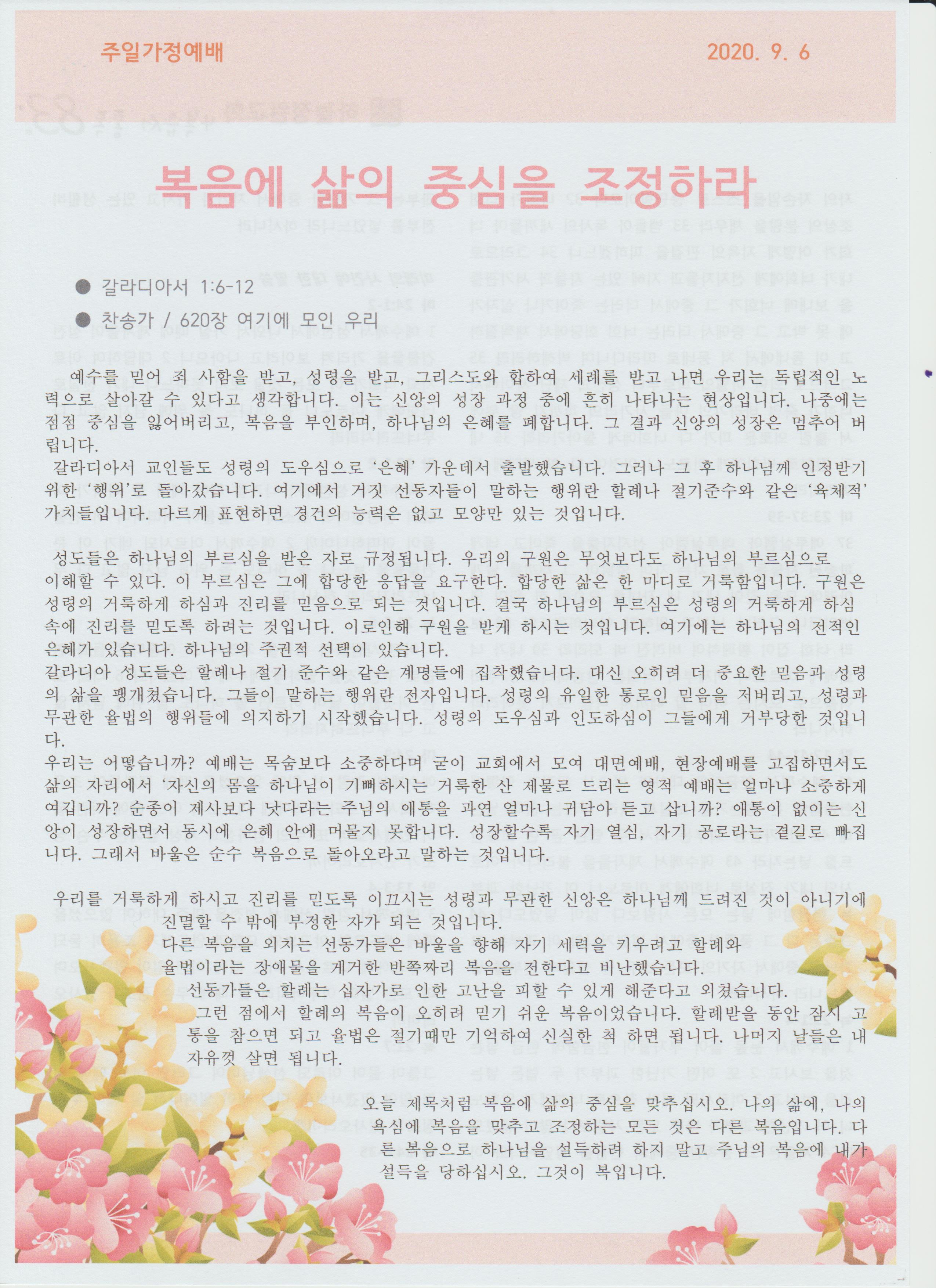 우리는 어떻습니까? 예배는 목숨보다 소중하다며 굳이 교회에서 모여 대면예배, 현장예배를 고집하면서도 삶의 자리에서 ‘자신의 몸을 하나님이 기뻐하시는 거룩한 산 제물로 드리는 영적 예배는 얼마나 소중하게 여깁니까? 순종이 제사보다 낫다라는 주님의 애통을 과연 얼마나 귀담아 듣고 삽니까? 애통이 없이는 신앙이 성장하면서 동시에 은혜 안에 머물지 못합니다. 성장할수록 자기 열심, 자기 공로라는 곁길로 빠집니다. 그래서 바울은 순수 복음으로 돌아오라고 말하는 것입니다.