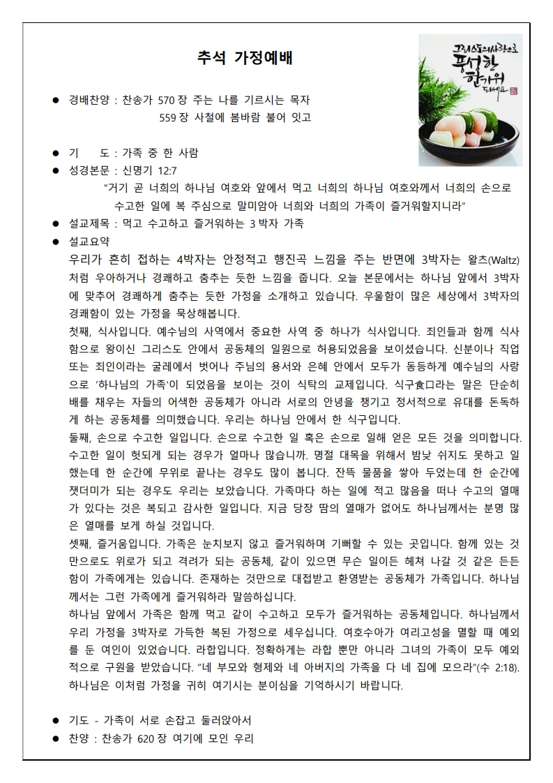 설교제목 : 먹고 수고하고 즐거워하는 3박자 가족